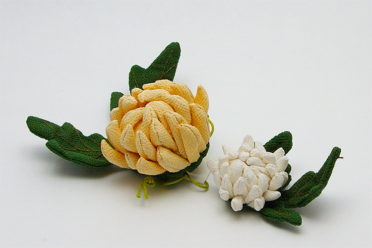 ちりめん細工の菊袋も色々な種類の作品が作られていて、見る者の目を楽しませてくれます。