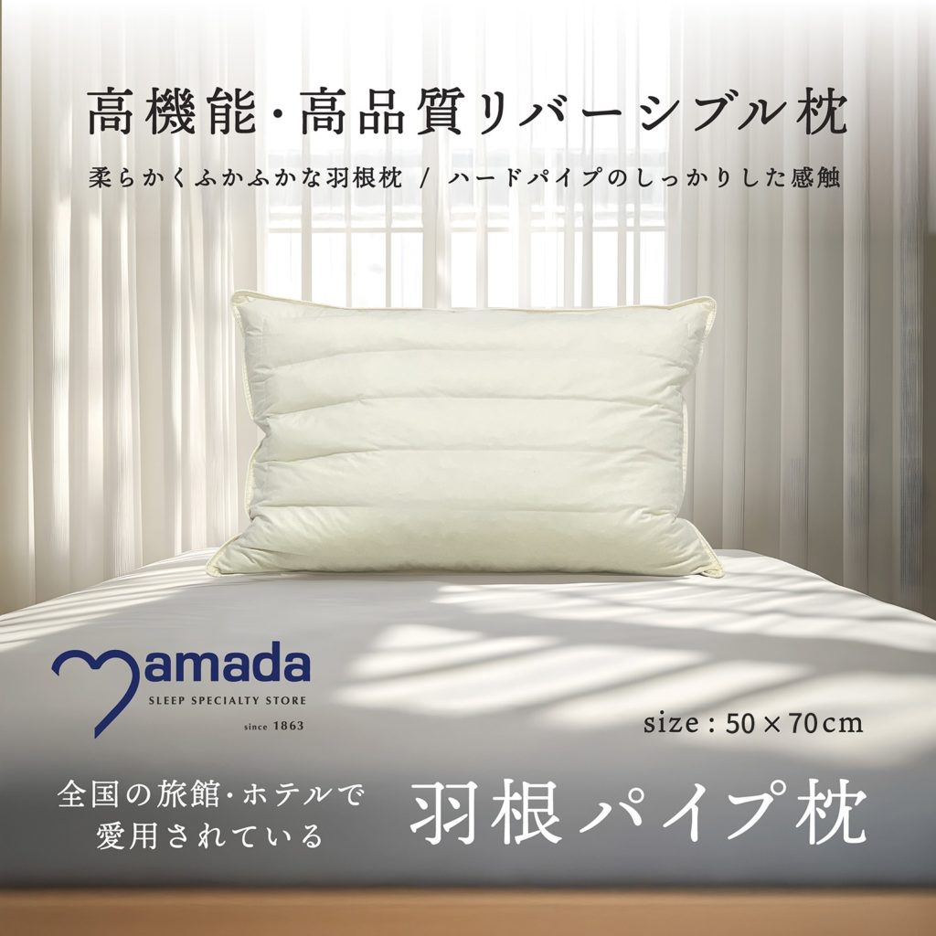 羽根のふんわり感と、パイプのしっかり感を組み合わせた「かための枕」です。