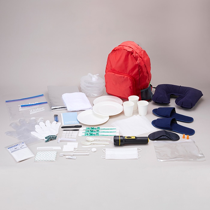 災害時に避難所となる体育館や公民館、車中など安全な場所への「一次避難」でお役に立てる防災グッズのセットです。