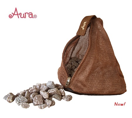 新製品は取っ手部分が「Aura」ロゴ表示(旧製品は〔いい湯種〕でした)。メッシュ袋がナイロン製に替わります。開口部が大きくなり、スライドファスナーは上から下に下げて開くようになって安全ロック付きになります。