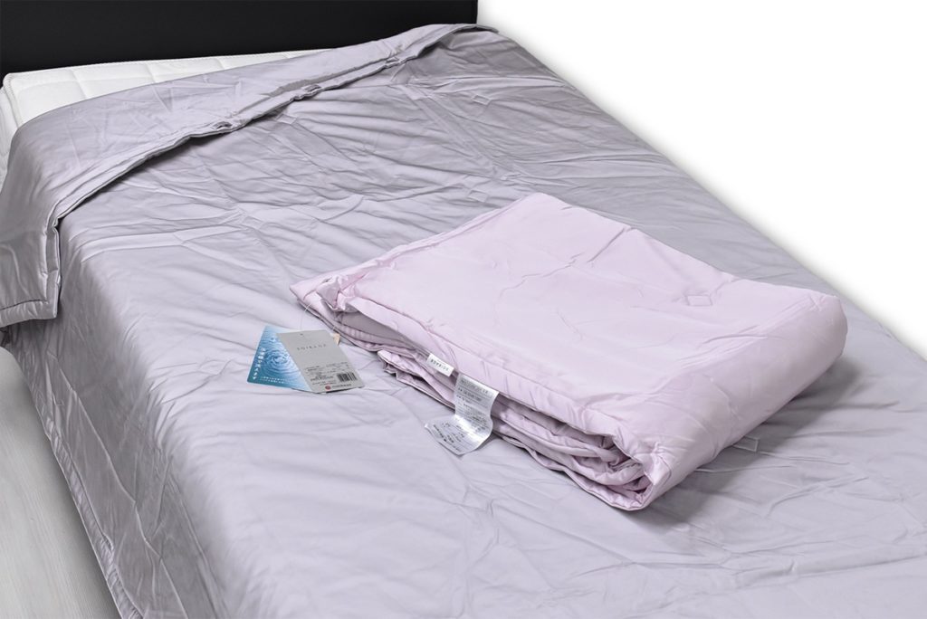 シルク&レーヨン混の側生地は、ひんやり心地よい寝心地です。冬は内側に掛けることで身体にフィットして冷気を防ぎ暖かい。