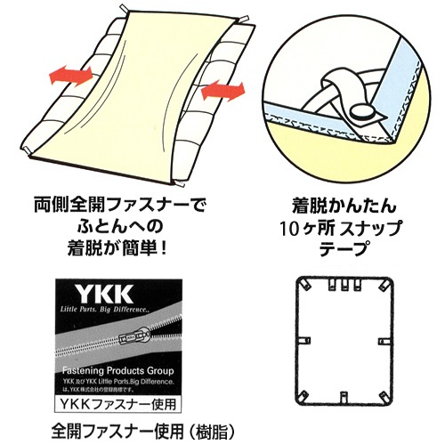 10ヶ所スナップひも付、両サイド全開ファスナー(各スライダー2コ付)