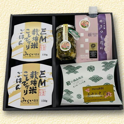 松阪の海で育ったあおさにしその実を入れて香りも風味も良くなったあおさの佃煮と、洋食にも合うあおさのアヒージョ、松阪の海苔加工職人が作ったあさりのしぐれもセット。